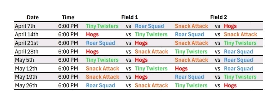 TEE BALL GAME SCHEDULE 2026: